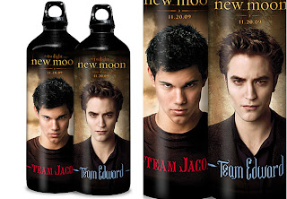 De acordo com informações do site da “People”, as garotas encontrarão a garrafa inspirada no vampiro Edward (Pattinson) e no lobo Jacob (Taylor). Nos dizeres os produtos possuem os dizeres: Time de Edward e Time de Jacob.